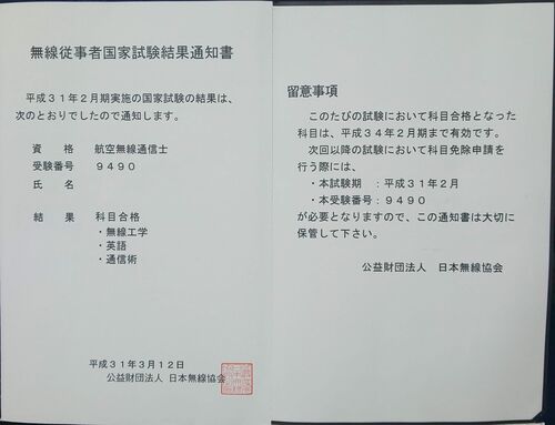 本日帰宅すると、航空無線通信士試験の結果通知書が届いておりました。 不合格は昨日のWeb発表で確定しています(ToT) また科目合格についても自己採点の結果では「法規」のみ不合格だと見込まれております。 けどマークミスということもありえますからね。 …