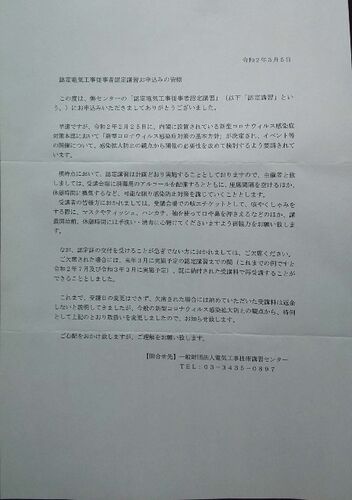 エックス線の試験から帰宅すると電気工事技術講習センターから速達郵便が届いていました。 (認定電気工事従事者や第一種電気工事士の講習をやってる団体です) もしや中止・・・?と思って開けてみるとこんな案内が入っていました。 要約すると講習はやるけど…
