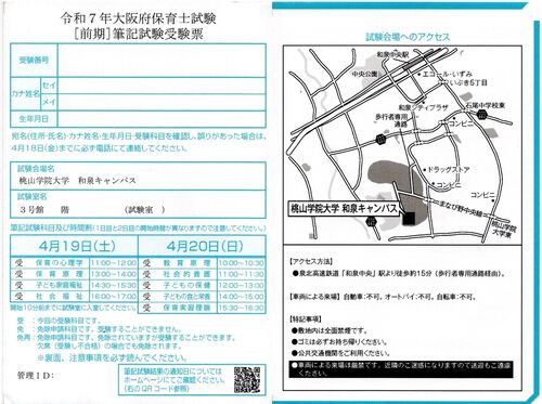 保育士試験の受験票が到着しました! 昨年は体調不良で出願はしたものの受験辞退したので、初めての挑戦となります! 去年も言ってましたが相変わらず受験票の到着がギリギリですね。 さて、前回の会場は大阪商業大学でしたが、今回の会場は桃山学院大学とな…
