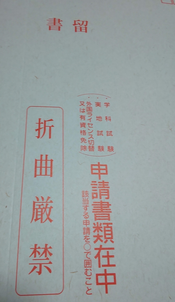 今回は学科試験なので、ネット通販なりなんなりで入手した19号様式と納付書と返信用封筒2通(84円切手貼付)をめちゃくちゃでかい、硬い専用封筒で一般書留で送ります。