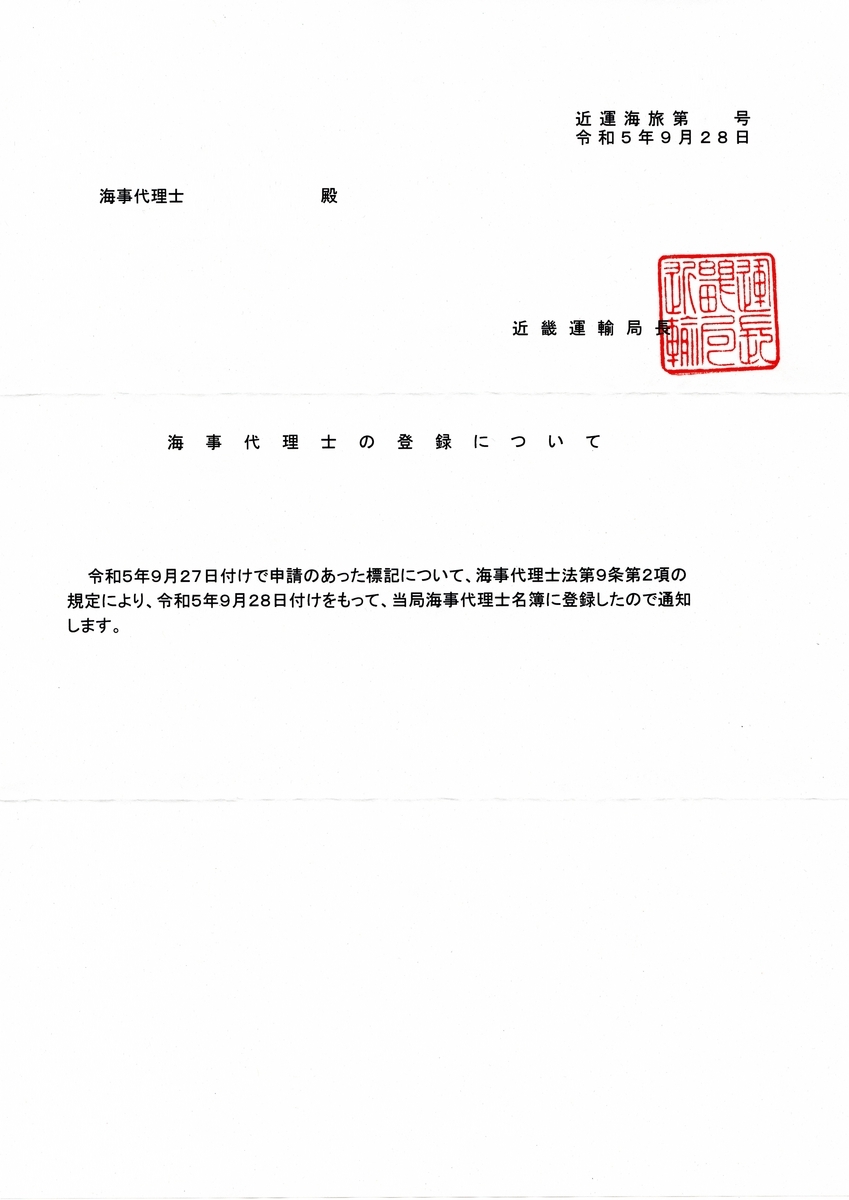となると、登録番号とかも存在せず、私が海事代理士有資格者である証明はこの紙のみとなります。